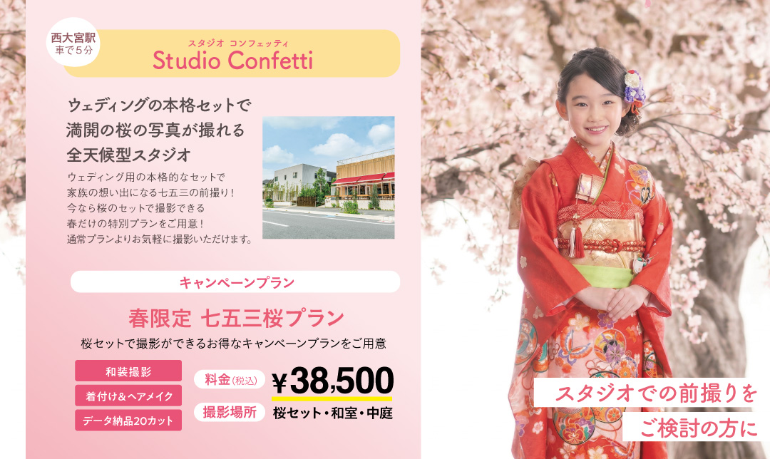 ご卒業、ご入学、そして新生活のスタートなど、春は特別な記念日がたくさんの季節ですね。 皆様の春の思い出作りを応援するため、当店「スタジオコンフェッティ」と姉妹店「篝日(かがりび)スタジオ」の2店舗にて、春の特別キャンペーンを開催いたします!